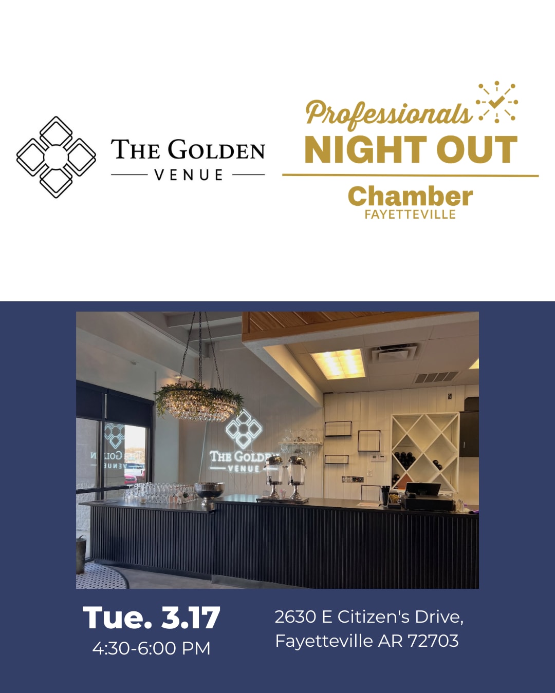 Professionals Night Out | Hosted by The Golden Venue Join us for an evening of networking, celebration, and business connections at Professionals Night Out, hosted by the incredible team at The Golden Venue! This beautiful private event space in Fayetteville offers full-service event support including catering, staffing, setup, and more—making it the perfect place to gather the business community for an evening of meaningful connections. The event will be hosted by the talented culinary and hospitality team from The Golden Table Collective, the group behind some of Fayetteville’s favorite dining experiences including Mermaids, Isabella's Italian, TJ's Sandwich Shop, and Hugs Ice Cream. 📅 Tuesday, March 17 ⏰ 4:30 – 6:00 PM 📍 2630 E Citizens Dr #20, Fayetteville And yes… it’s St. Patrick’s Day 🍀 — so expect a little extra fun while we mix great networking with even better hospitality. Bring your business cards, bring a colleague, and come ready to make great connections and do some serious business development with fellow professionals in the Chamber Fayetteville community.